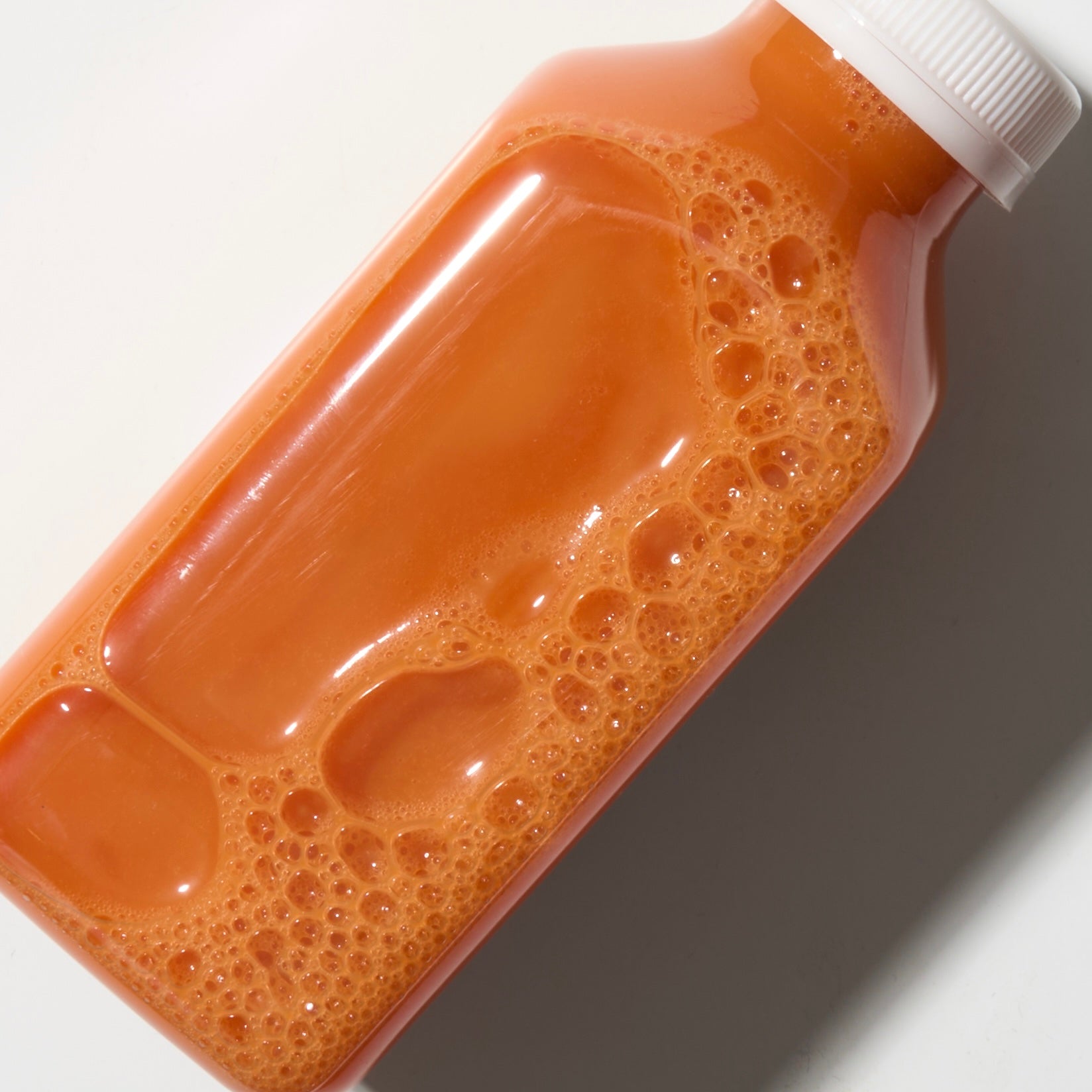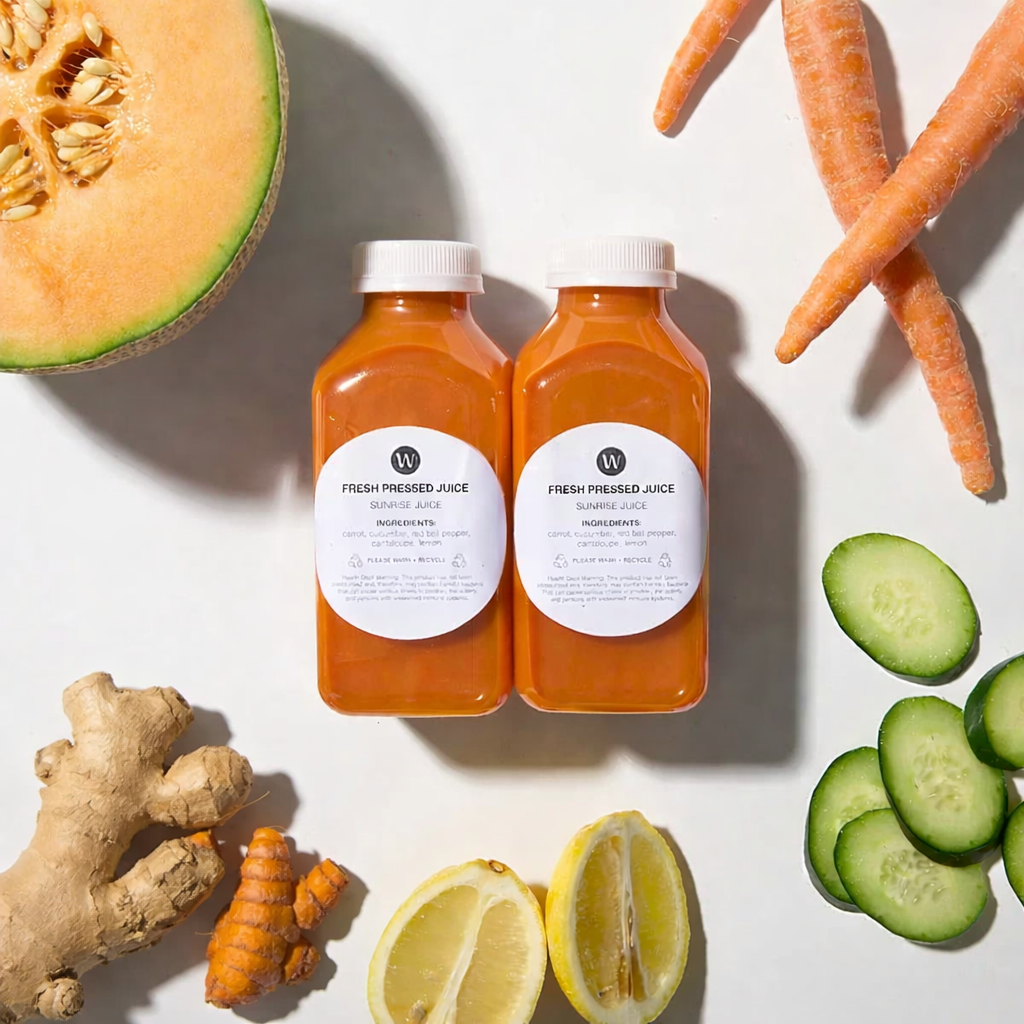 Two bottles of our vibrant Sunrise Juice, packed with carrots, cantaloupe, cucumbers, lemon, ginger & turmeric to keep you feeling grounded, energized + totally refreshed.